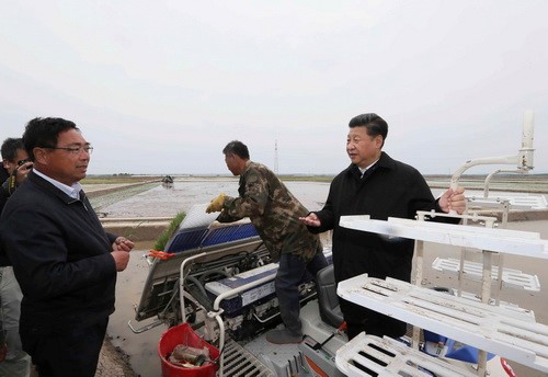 習近平來到黑龍江省撫遠市玖成水稻種植專業合作社,了解合作社土地流轉和采用先進種植技術提高水稻產量效益等情況。(圖片來源:新華視點)