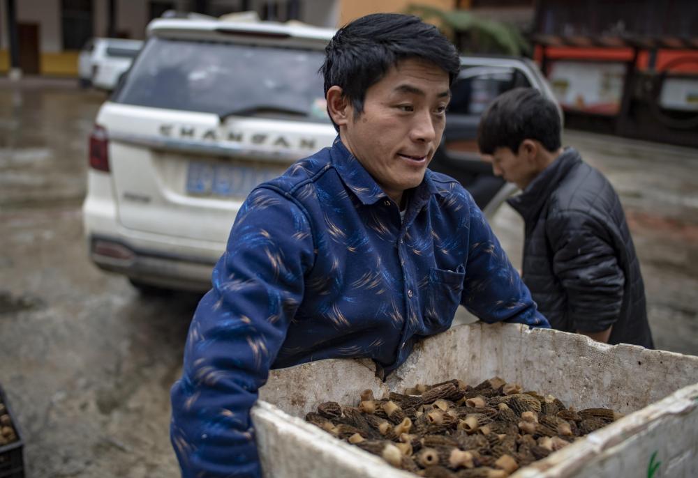 云南貢山縣獨龍江鄉龍元村“致富能手”和曉永在鄉里賣羊肚菌(2019年4月19日攝)。 新華社記者 江文耀 攝
