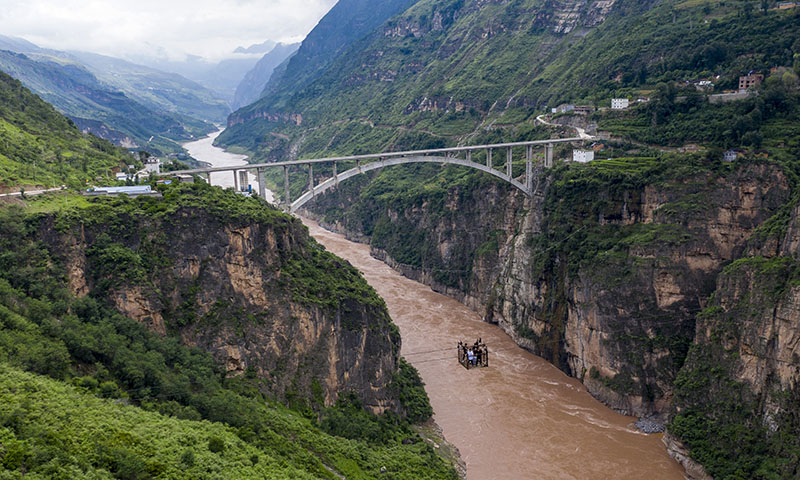 游客們在體驗云南省巧家縣茂租鎮鸚哥村村民蔣世學操作的溜索過江(2020年8月14日攝,無人機照片)。新華社記者 江文耀 攝