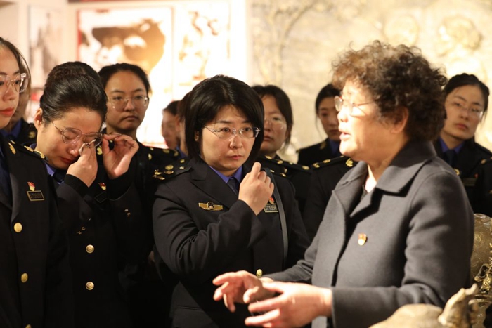 2021年3月5日,山東省臨沂市沂南縣綜合行政執法局女黨員聆聽于愛梅(右二)講紅嫂擁軍支前故事,很多黨員被感動流淚。杜昱葆 攝