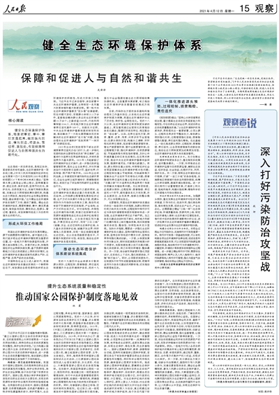 習近平總書記指出:“生態是統一的自然系統,是相互依存、緊密聯系的有機鏈條。”《中華人民共和國國民經濟和社會發展第十四個五年規劃和2035年遠景目標綱要》堅持系統觀念,堅持綠水青山就是金山銀山理念,對推動綠色發展、促進人與自然和諧共生作出了全面部署。本期觀察版圍繞健全生態環境保護體系這一主題,從推動生態環境保護體系建設系統集成、形成大環保工作格局、深入打好污染防治攻堅戰、推動國家公園保護制度落地見效等方面進行探討。