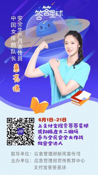 6月1日-21日,登錄支付寶答答星球開啟挑戰之旅,與安全達人PK安全知識,中國女排前隊長惠若琪為你加油打氣,快來參加吧!