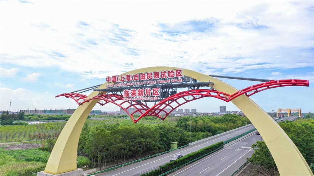 位于上海浦東新區S2滬蘆高速公路上的中國(上海)自由貿易試驗區標志門。(無人機照片,新華社記者方喆攝)