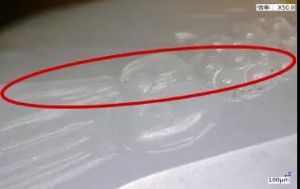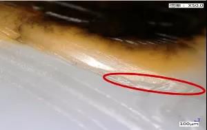 經過檢測人員的仔細觀察發現,有皮色部位與白色主體接觸的部位具有強藍白色熒光,且形成封閉的環形;在特殊角度下使用高倍顯微鏡觀察,可以看到非常細小的拼合縫,如不留意觀察則極難發現。