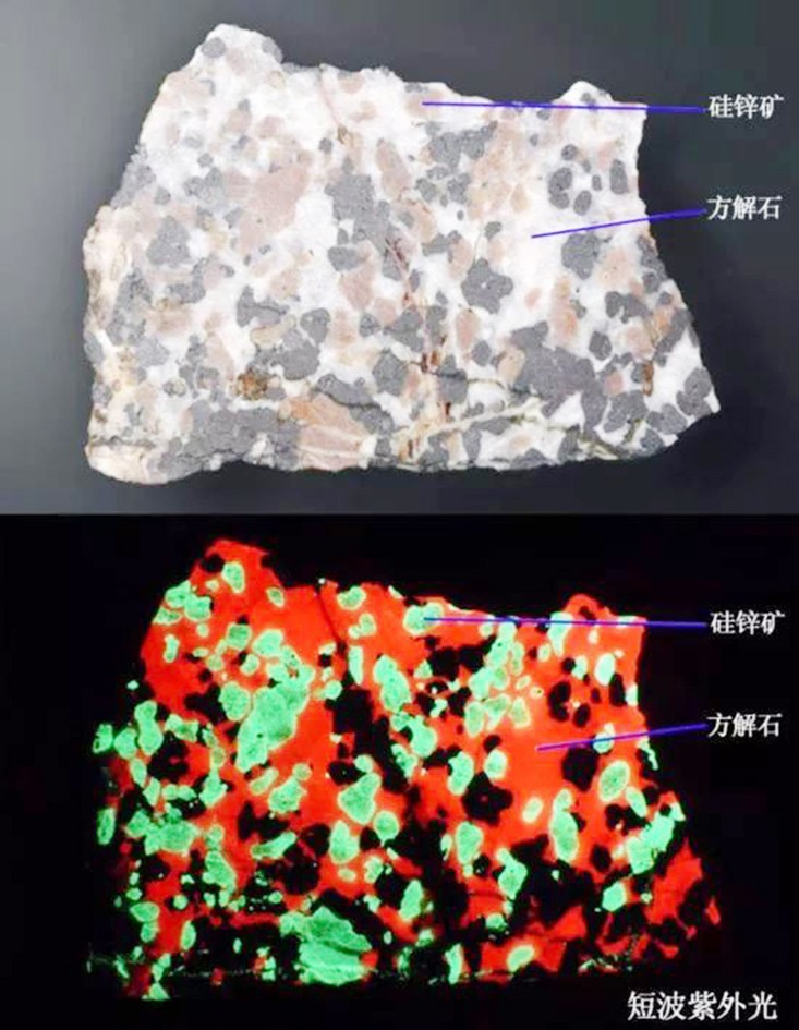 這是一種非常容易識別的含有熒光礦物的巖石,其中的兩種礦物會在短波紫外光下發出強烈的熒光:方解石(Calcite)發出紅色熒光,硅鋅礦(Willemite)發出綠色熒光。紅綠對比強烈,再加上沒有熒光的黑色鋅鐵礦(NFFranklinite),非常具有觀賞性。通常這種巖石被稱為“圣誕方解石(Christmas Calcite)”或者“瘋狂方解石(CrazyCalcite)”。