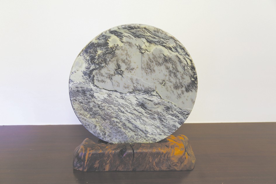 用白玉、青玉雕琢的佩件、掛件、擺件等產品自不必說,用草花玉琢出的玉石產品更是別致珍貴。有一件《隴上秋色》的橢圓形掛件,晶瑩潔白的玉體中含有草狀物質,這些億萬年前凝固在玉石中的草,有的呈黃色,有的呈灰色,有的呈褐色,有的呈黑色。更為神奇的是,各色草形成一幅隴上秋色的天然畫卷,一行行隴上秋樹、一道道隴上土坎、一座座隴上山巒……畫面栩栩如生,令人愛不釋手。另一件《江畔即景》的圓形擺件,草狀物質組合得更加神奇,一條江河波濤洶涌、浪花滾滾,江畔古樹枝繁葉茂,遠山層巒疊嶂,植被蔥蘢,恰似一幅絕妙的山水畫卷!