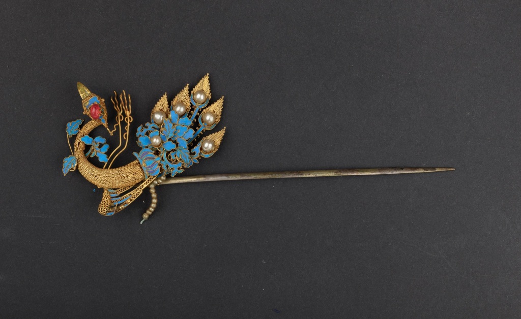 點翠嵌珠寶鎏金銀鳳簪,清代,孔府舊藏。銀質鎏金;鳳形,整器以累絲和點翠等工藝裝飾,鑲嵌紅寶石、珍珠點綴。“簪”是古時漢族婦女的一種發飾,是古代婦女發型中最基礎的固定和裝飾工具,由“笄”發展而來的,用來綰定發髻或冠的長針。《后漢書·輿服志》有:“黃金龍首銜白珠,魚須擿,長一尺,為簪珥”的記載。