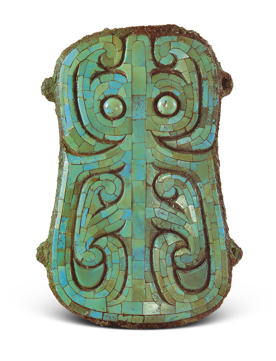 嵌綠松石獸面紋牌飾,飾長14.2厘米、寬9.8厘米,屬二里頭文化二期(約公元前1720~前1565年),1981年出土于河南偃師二里頭,現藏中國社會科學院考古研究所。其整體呈盾牌狀,表面用許多形狀、大小不同的綠松石鑲嵌成獸面紋。此器選料及制作都非常精細,圖像表達拙樸細膩,立體感強烈。該器發現時位于墓主人胸部偏左,應具有裝飾功能。二里頭發現的三件青銅牌飾保存均較完整,形態相近,其紋飾堪稱青銅器表面最早的獸面紋。相似的器物在四川盆地、新疆哈密等地均有發現,四川廣漢三星堆、高駢出土的青銅牌飾獸面形象相對簡單,新疆天山北路墓地等發現的牌飾則更簡單,未鑲嵌綠松石。此類器物涉及多種文化和技術元素,應該是相關考古學文化交流融合的產物。