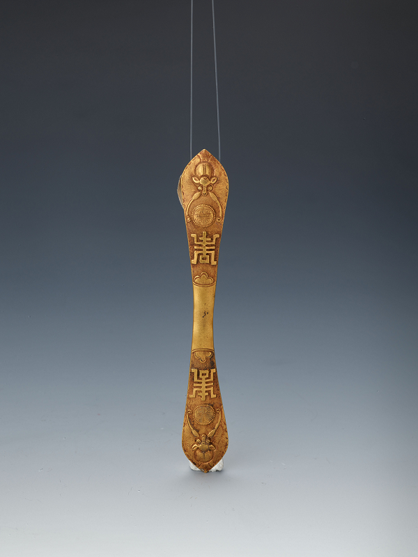 鏨刻福壽紋金發簪圈,清代,曲阜方家村出土,現藏于孔子博物館。發簪是古代男女常用的首飾,呈單股長針狀。最初的用途是綰束頭發。古代制作簪子的材質有金、銀、玉、銅、鐵等,充當著男女情愛的信物和談婚論嫁的聘物。唐·杜甫《春望》詩:“白頭搔更短,渾欲不勝簪?!?/p>