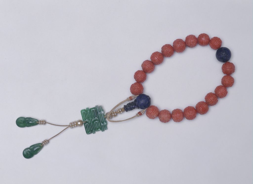 手串以十八顆珊瑚珠串成,以青金石佛頭、結珠及翡翠墜為飾。手串雕工精細,雕刻四面“囍”字的珊瑚珠與兩面“囍”字的青金石佛頭、結珠,使本來不甚鮮亮的珠體倍加耀眼;翠墜角雖小,但也是將雕刻發揮到了極致,將一只蝙蝠口銜“五銖”錢幣的動態雕琢得栩栩如生,并具有“福在眼前”之吉祥寓意。此為清代后妃首飾。