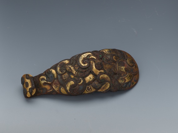 器扁寬,呈琵琶形,通體錯金銀。獸首狀鉤,鉤面飾相互交錯纏繞的蟠虺紋,鉤背飾卷云紋,有一釘狀鈕,鈕面飾渦紋。