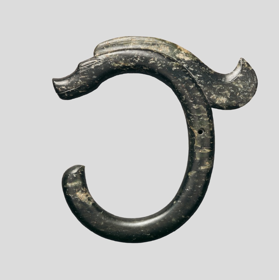 新石器時代紅山文化玉龍高26厘米,呈勾曲形,口閉吻長,鼻端前突,上翹起棱,端面截平,有并排兩個鼻孔,頸上有長毛,尾部尖收而上卷,形體酷似甲骨文中的“龍”字。玉龍墨綠色,體卷曲,平面形狀如一“C”字,龍體橫截面為橢圓形,直徑2.3-2.9厘米。龍首較短小,吻前伸,略上噘,嘴緊閉,鼻端截平,端面近橢圓形,以對稱的兩個圓洞作為鼻孔。龍眼突起呈棱形,前面圓而起棱,眼尾細長上翹。頸背有一長鬃,彎曲上卷,長21厘米,占龍體三分之一以上。鬃扁薄,并磨出不顯著的淺凹槽,邊緣打磨銳利。龍身大部光素無紋,只在額及鄂底刻以細密的方格網狀紋,網格突起作規整的小菱形。