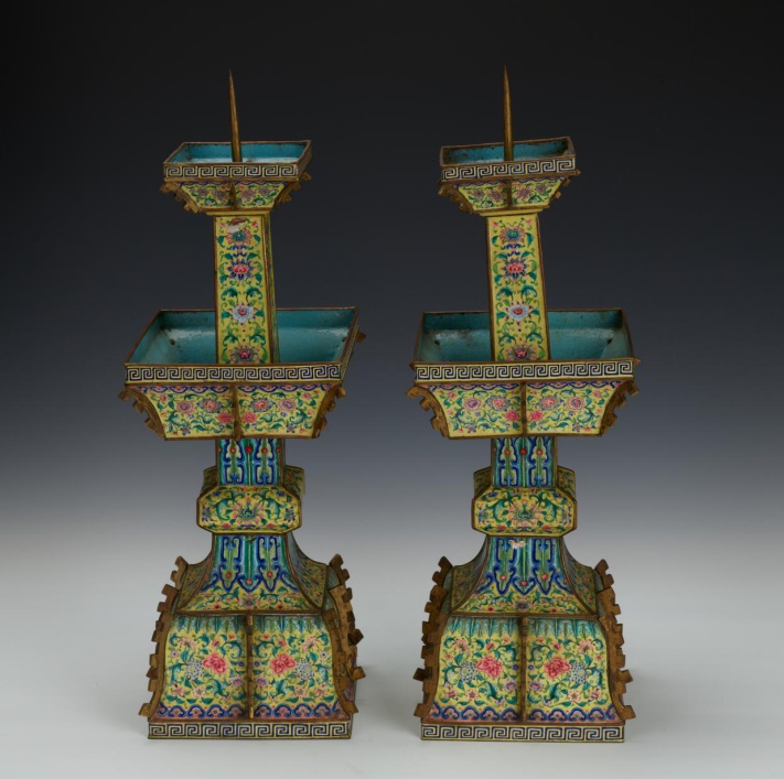 燭臺共兩件,形制相同。銅胎。由上下兩盤、承柱、方形高圈足組成,上盤內(nèi)有銅釬用以插燭,器身飾扉棱。盤內(nèi)壁施淺藍(lán)色琺瑯釉,外壁以黃色琺瑯釉為地,飾回紋、纏枝花卉紋、蕉葉紋、如意云頭紋等。