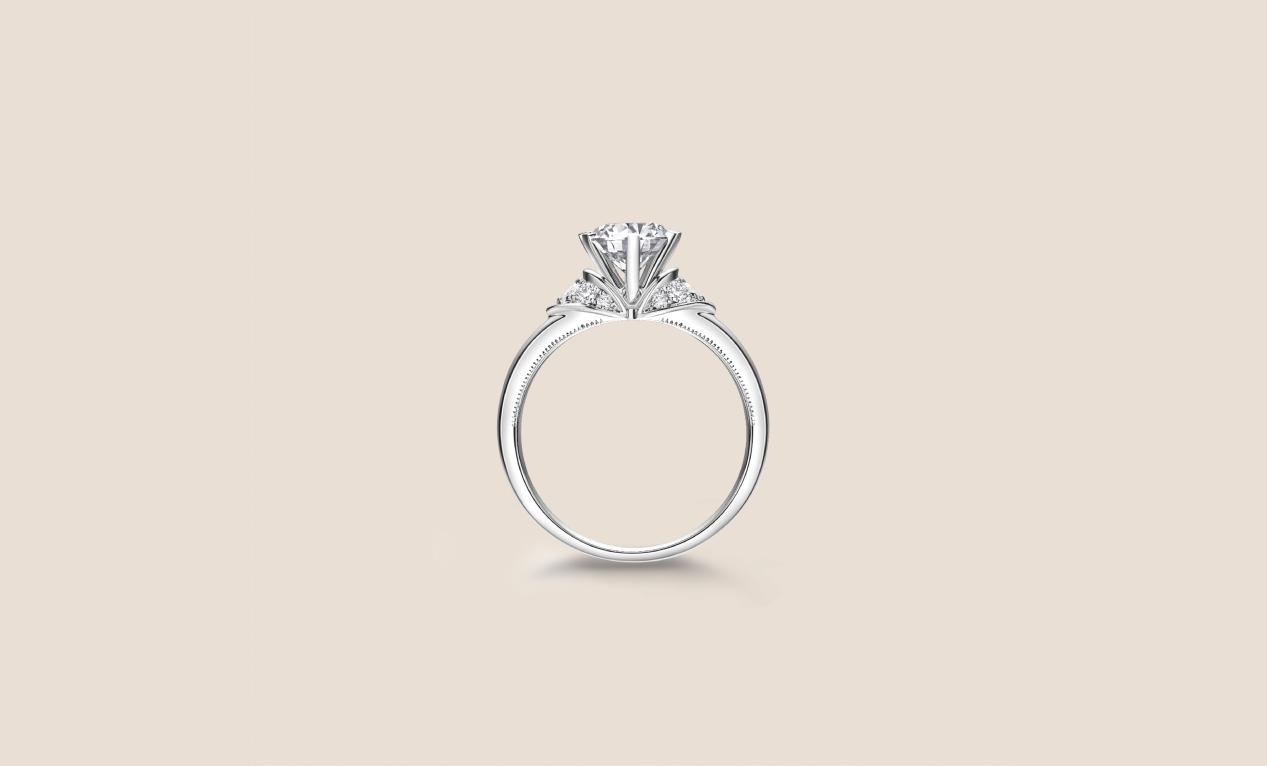 “Beauty風姿”鉆戒,經典的六爪鑲高高托起,爪鑲小鉆化成的披肩斗篷,與戒臂處精細的露珠邊相襯,高貴迷人的女性氣質呼之欲出。