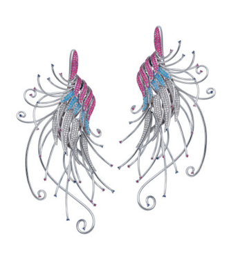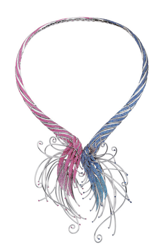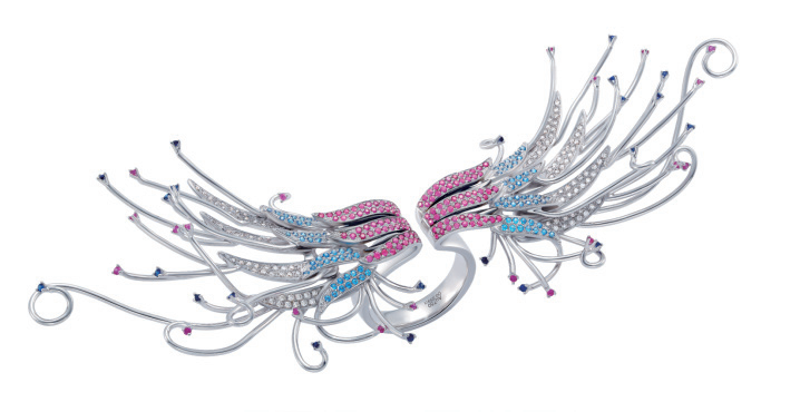 對比這一珠寶首飾造型形式要求首飾設計元素間要有明顯的差異性,例如虛與實、聚與散,大與小、銳利與圓潤等,也可以包括位置與顏色的強烈差異。這些劇烈的變化,給人以鮮明醒目、跌宕起伏的視覺感受,從而加強作品的藝術表現力。