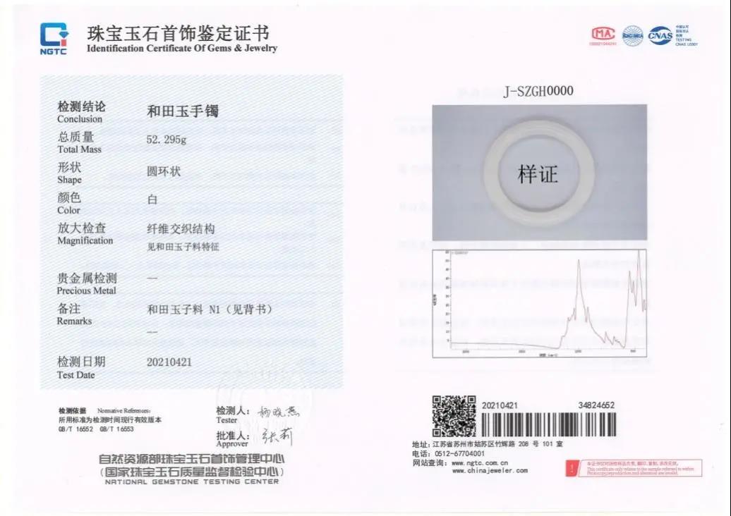 ▲珠寶國檢和田玉子料鑒定證書樣證