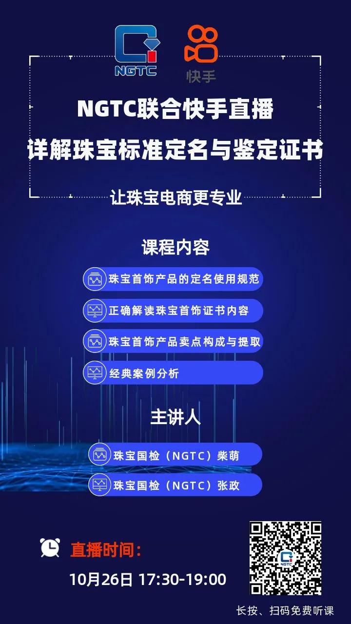 那就不能錯過10月26日(下周一)17:30—19:00,珠寶國檢(NGTC)聯合快手開展的主題網絡培訓直播,詳解珠寶標準定名與鑒定證書,讓珠寶電商更專業。屆時珠寶國檢(NGTC)國檢珠寶培訓中心商學院院長柴萌、珠寶國檢(NGTC)北京實驗室張政將直擊珠寶直播賣貨痛點,教你如何“反套路真營銷”!
