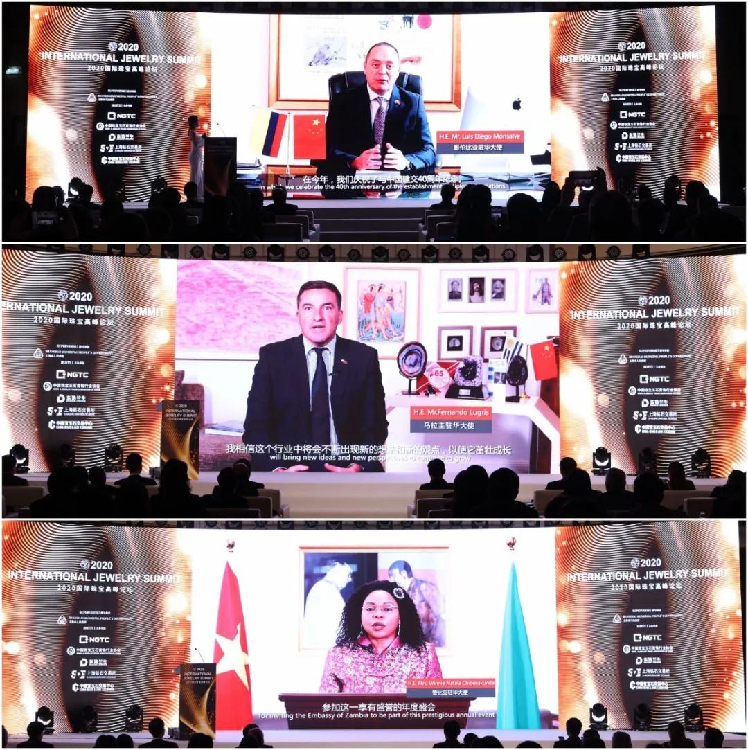 哥倫比亞駐華大使Luis Diego Monsalve、烏拉圭駐華大使Fernando Lugris、贊比亞駐華大使Winnie Natala Chibesakunda 通過視頻演講,表達了對第三屆進博會及2020國際珠寶高峰論壇成功舉行的祝賀。