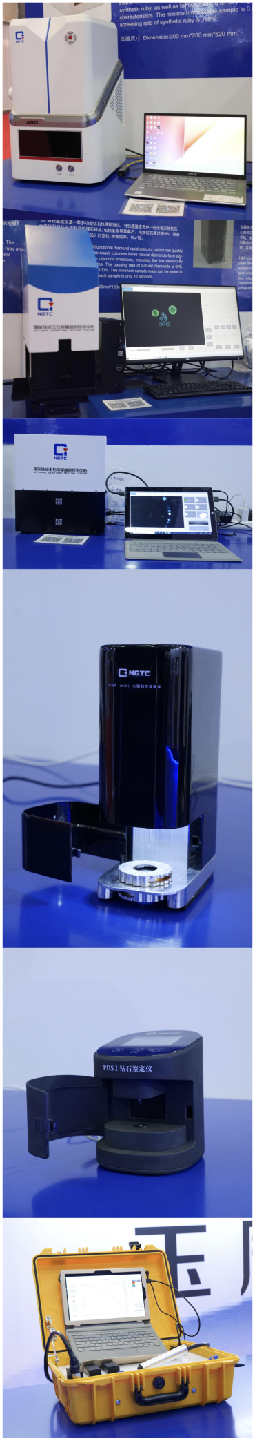 珠寶國檢(NGTC)展出六款“智能化”檢測設備包括:珠寶首飾觀察鑒定儀 DDO mini、鉆石鑒定儀PDS I、心箭效應觀察儀H&A mini、摻假金條檢測儀、珠寶首飾觀察鑒定儀DDO 3210N及紅寶石快速鑒定儀ARD。