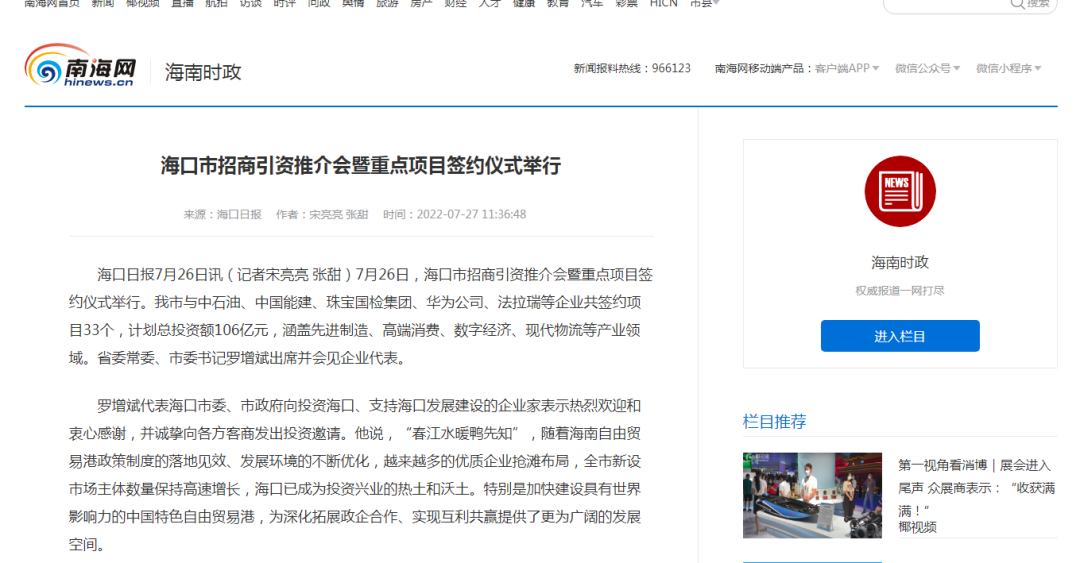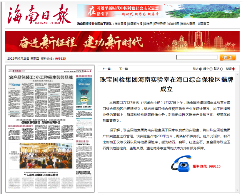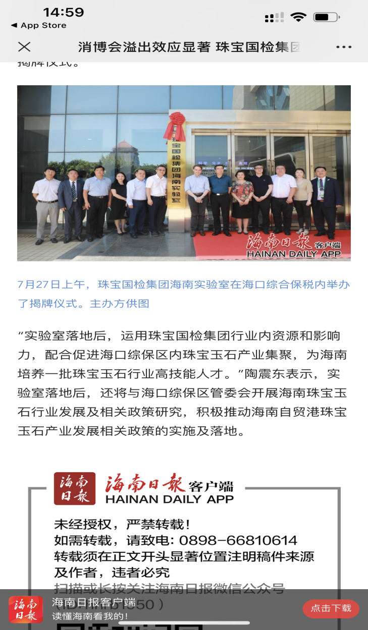 7月25日-30日,珠寶國檢集團受邀參加第二屆中國國際消費品博覽會(下簡稱消博會),作為權威的國家級珠寶檢測機構,珠寶國檢集團為消博會提供的綜合科技服務得到參展商、采購商、消費者的一致好評;在消博會期間,珠寶國檢集團受邀出席海口市招商引資推介會暨重點項目簽約儀式,珠寶國檢集團海南實驗室正式揭牌,以科技服務海南自貿港珠寶玉石產業發展。以上系列服務與舉措獲得海南電視臺新聞頻道、海南日報、海南日報客戶端、海口日報等媒體的關注與報道。