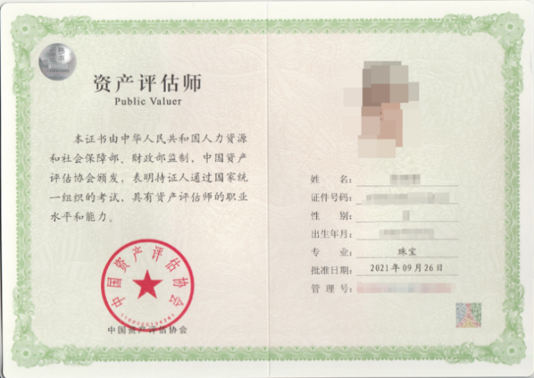A:《中華人民共和國資產評估師(珠寶)職業資格證書》由人力資源社會保障部、財政部監制,中國資產評估協會用印。