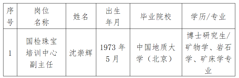 按照自然資源部珠寶玉石首飾管理中心招聘工作方案要求,經過發(fā)布招聘公告、資格審查、面試、體檢、查閱人事檔案等程序,經黨委會議研究,擬聘用沈崇輝同志為國檢珠寶培訓中心副主任,現(xiàn)予以公示。