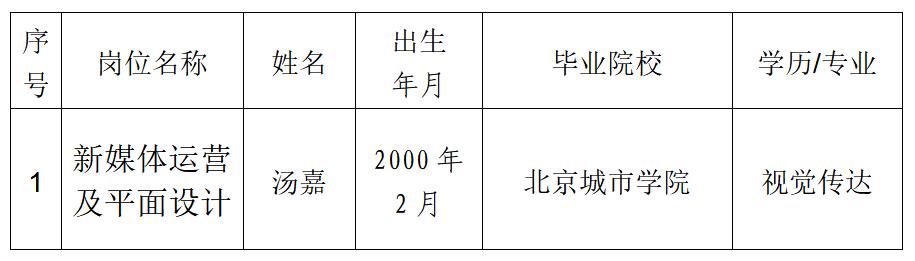 按照北京國臻文化傳播有限公司招聘工作方案要求,經過發布招聘公告、資格審查、面試、體檢等程序,經董事會議研究,擬聘用湯嘉同志為公司工作人員,現予以公示。
