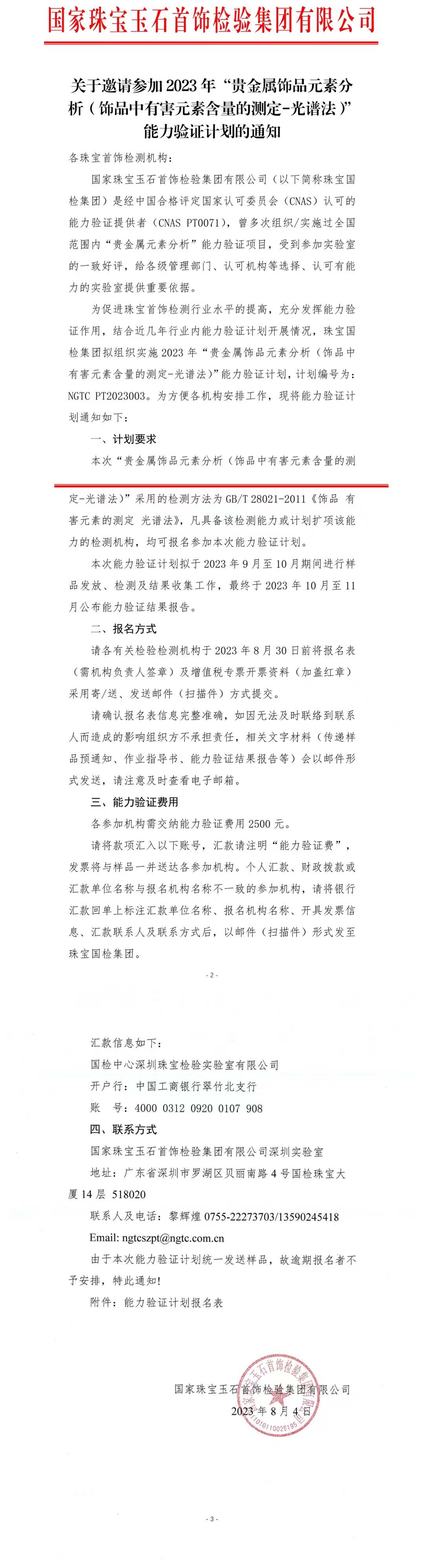 關(guān)于邀請(qǐng)參加2023年“貴金屬飾品元素分析(飾品中有害元素含量的測(cè)定-光譜法)”能力驗(yàn)證計(jì)劃的通知
