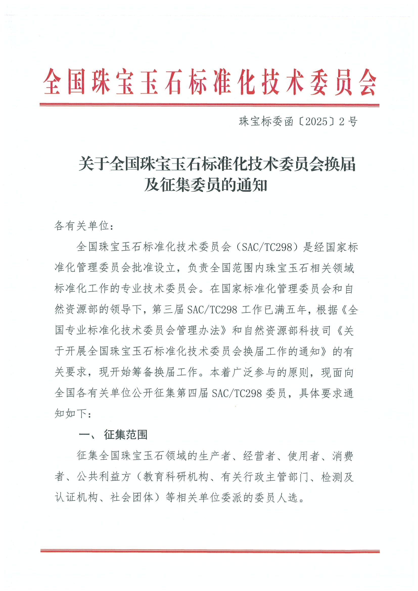 關于全國珠寶玉石標準化技術委員會換屆及征集委員的通知