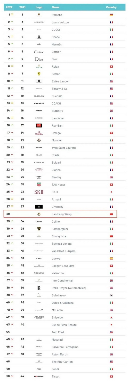 “2022全球高檔和奢侈品牌價值50強”發布,老鳳祥位列第28位