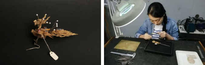 在修復時,我發現一件特別神奇的事情,就是冠飾的鳳上都有用彈簧絲頂著的珍珠。當把這組冠飾修復好后擺在那里,只要有人在這個空間里走動,彈簧上的珍珠就開始不停地顫動,有著非常強烈、自然的動感。