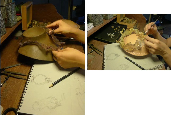 在制作過程中,銅絲采用的是明朝“狄髻”的一種工藝,編織成形后,在上面鎏上漸變的金色,然后就可以綴珍珠了。綴珍珠就是把不同紋理、不同色澤的珍珠,跟彈簧絲一起一個一個綴在金絲網上。這是一個特別享受的過程。