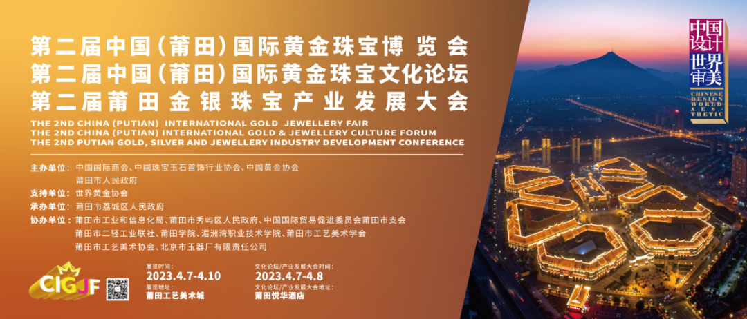 3. 創新品牌力量、助力產業升級 本屆博覽會著眼于促進中國黃金珠寶首飾行業新時代下的國際化進程,致力于將首屆博覽會孵化的鄉村振興項目“莆城故事·工美小鎮”的轉型蝶變再次展現給世界人民。鄉村振興與博覽會發揮各自優勢、互相賦能,以全方位、多角度的合作姿態,共同將鄉村振興推上文化特色發展道路。 “中國設計·世界審美” 第二屆中國(莆田)國際黃金珠寶博覽會 讓我們共話中華優秀傳統文化交流盛事, 共享世界黃金珠寶視覺盛宴, 共筑跨界融合產業發展新高地, 共譜傳承創新發展新篇章。 第二屆中國(莆田)國際黃金珠寶博覽會 時間:【2023年4月7—10日】 地點:【莆田工藝美術城】
